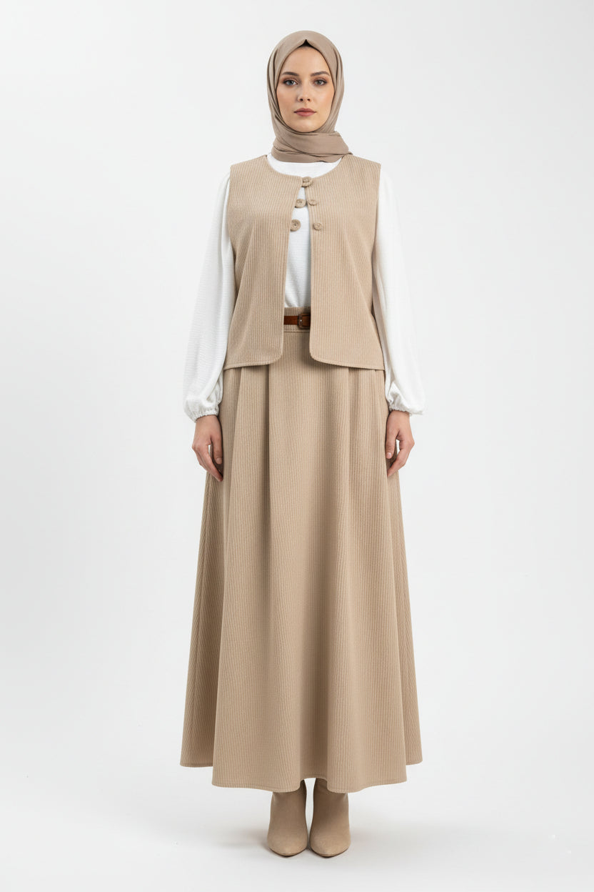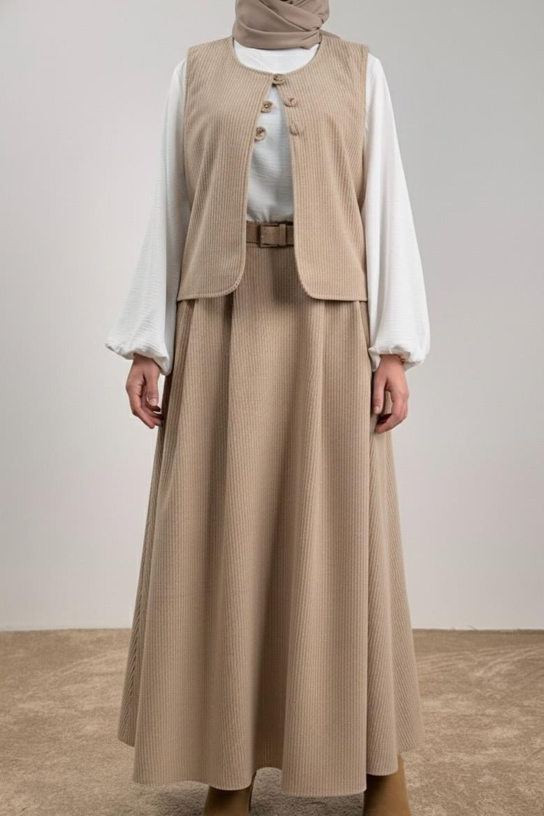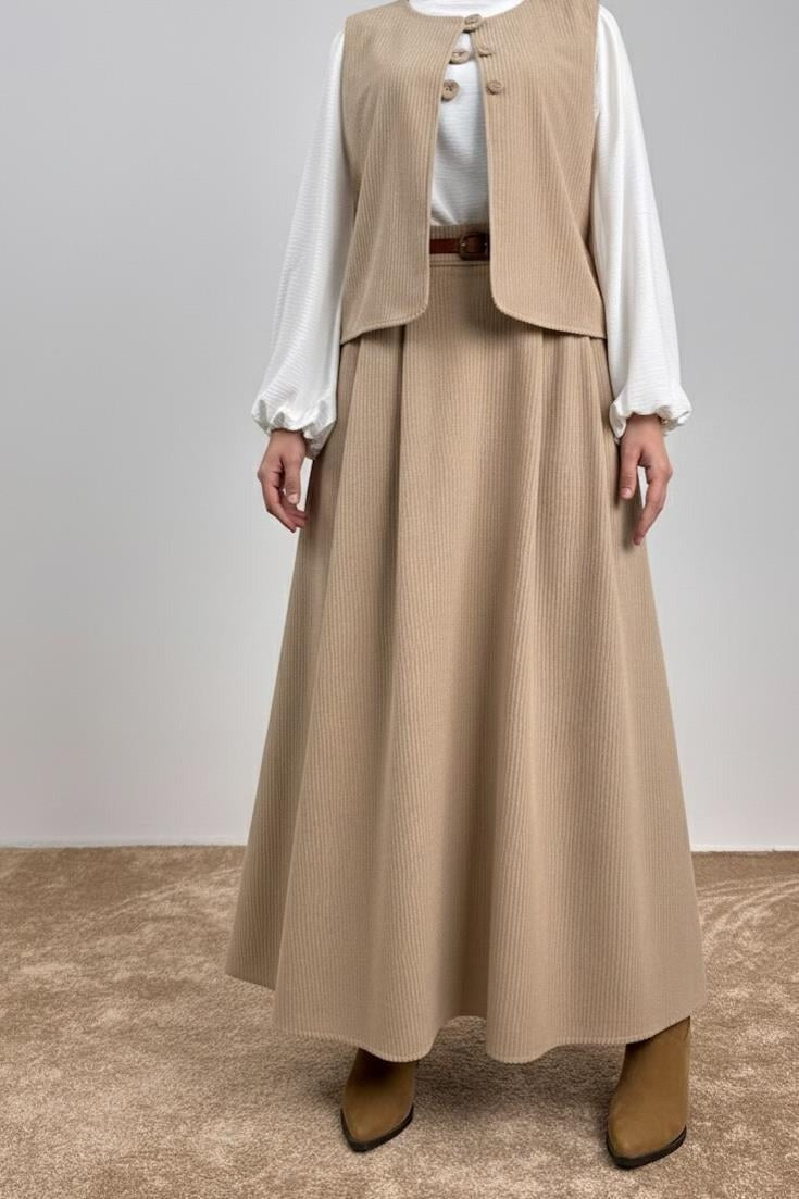 Découvrez l'Ensemble Lina Dream, une création élégante alliant confort et raffinement. Composé d'un gilet et d'une jupe en velours beige luxueux, cet ensemble incarne la sophistication moderne.