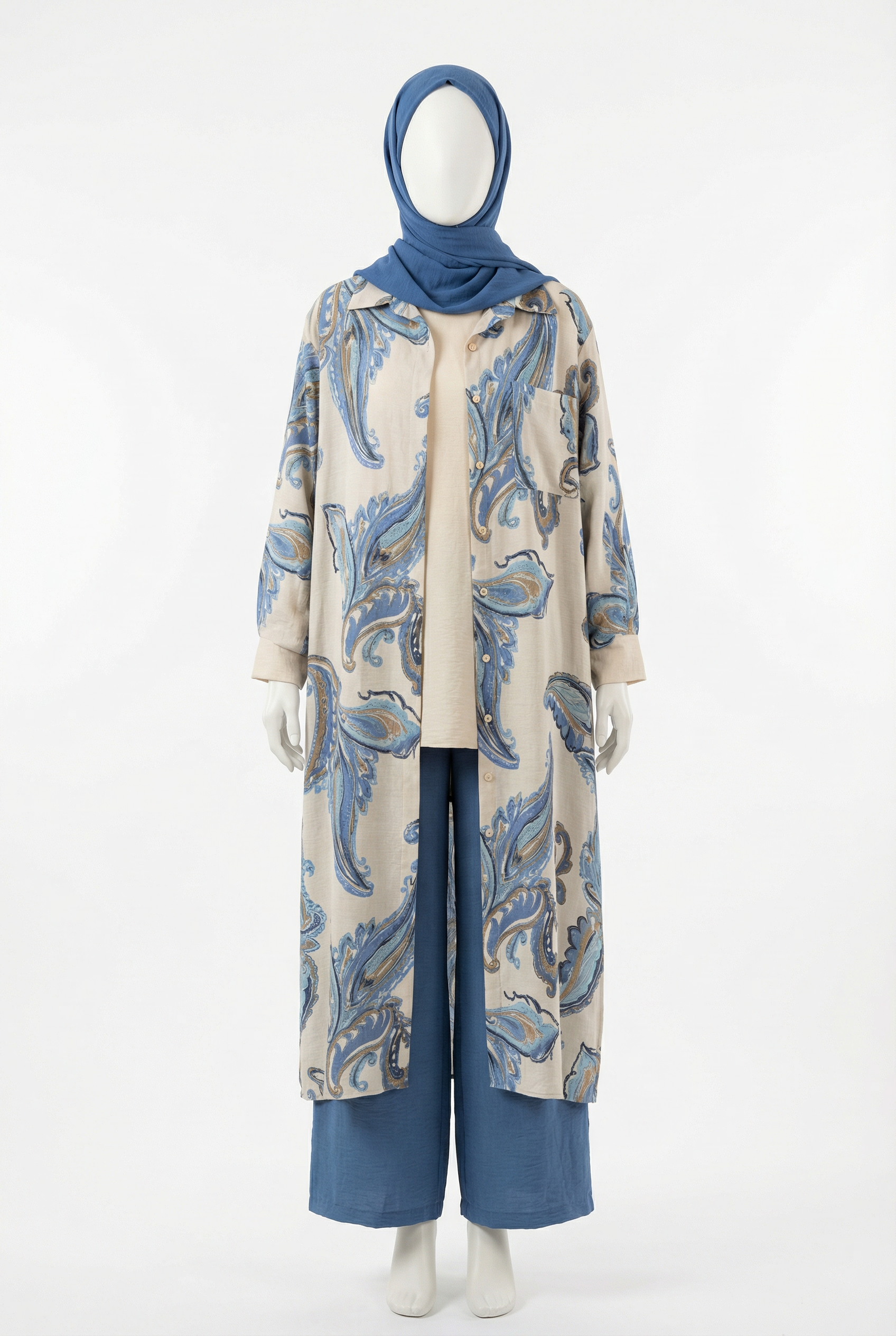 Découvrez l'élégance intemporelle avec notre Tunique Chemisier à Motifs Paisley, une création pensée pour les femmes qui valorisent à la fois l'expression artistique et la modestie. Son imprimé paisley bleu et doré sur fond beige confère une allure raffinée et distinguée à chaque tenue. Dotée d'un col chemisier classique, d'un boutonnage frontal pratique et d'une poche décorative, cette tunique allie fonctionnalité et sophistication. Les manches longues avec finition élastiquée assurent une couverture complète et un confort sans égal, tandis que sa coupe ample et fluide s'adapte parfaitement à un port en superposition ou en robe. Idéale pour les occasions religieuses, professionnelles ou quotidiennes, elle devient une pièce essentielle de votre garde-robe.